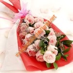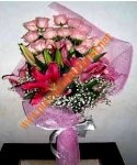| HB E46 Handbouqet ukuran besar panjang 60 cm lebar 40cm. Terdiri dari mawar pink holland kombinasi casablanca 5 batang dan babybretz dalam balutan nuansa pink yang romantis.